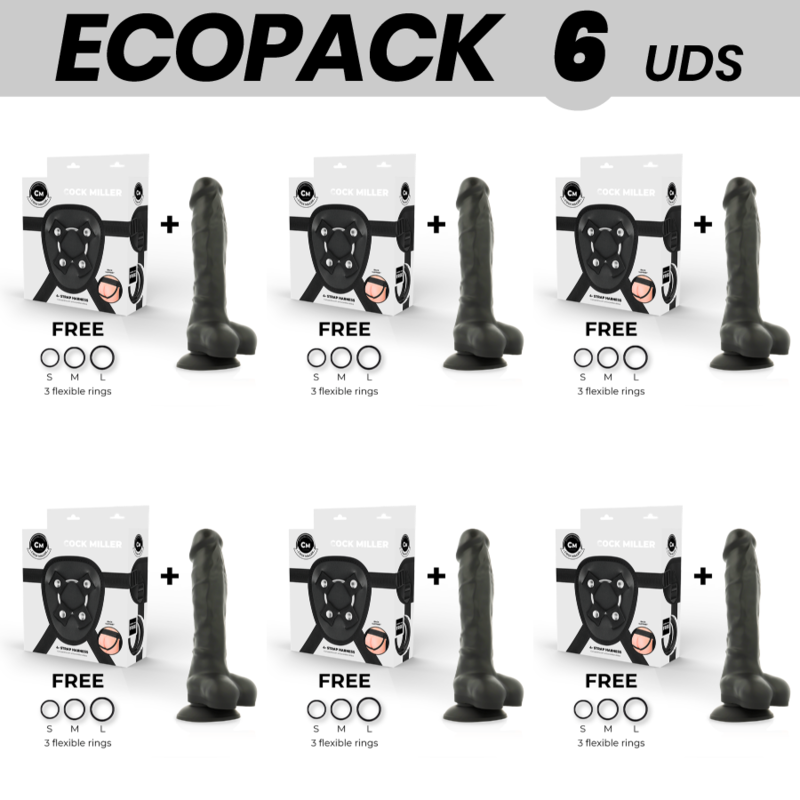 ECOPACK 6 UNITS – COCK MILLER HARNESS + SILICONE DENSITY ARTICULABLE BLACK COCKSIL 18 CM